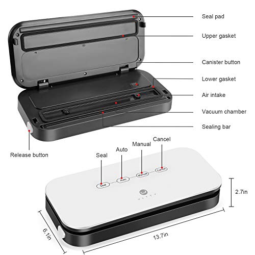 - Dry/Moist available – all modes are Dry/Moist available. Press Auto to vacuum seal normal foods(meats, fish, nuts), Manual for easy-to-deformed foods(bread, chips, homemade pastries). Also a vacuum hole on inside surface can vacuum jars, canisters, wine bottle by using with vacuum attachments.
